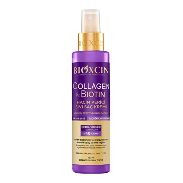 اسپری دو فاز حجم‌دهنده بیوکسین با ترکیبات مؤثر بیوتین و کلاژن، به افزایش حجم مو، تقویت ساقه و بهبود حالت‌پذیری موها کمک می‌کند.
